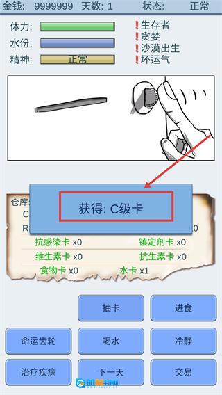 抽卡后或许会得到【C级卡】这类低级卡片,要是有【水卡】的话,建议优先用它来补充水分,保证生命值维持在一半以上,这样能防止出现生存危机。