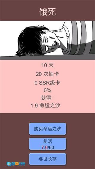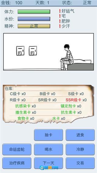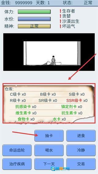 通过抽卡来获取食物、水、药物这类生存所需的资源,同时要注意体力和精神的消耗情况,合理平衡抽卡的频率与自身的生存状态。