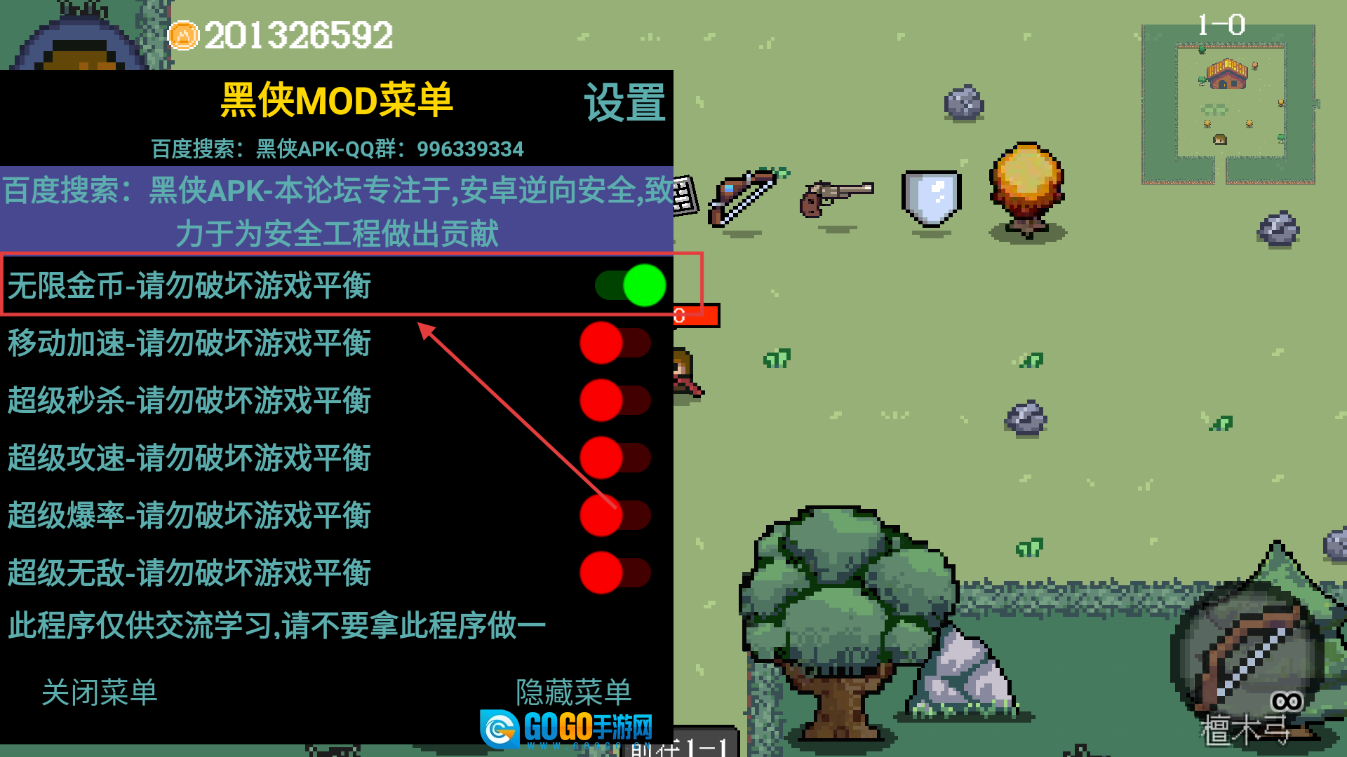 打开【黑侠MOD菜单】确认对应功能开启,借助该功能获取足够金币,以便为购买道具做好准备。