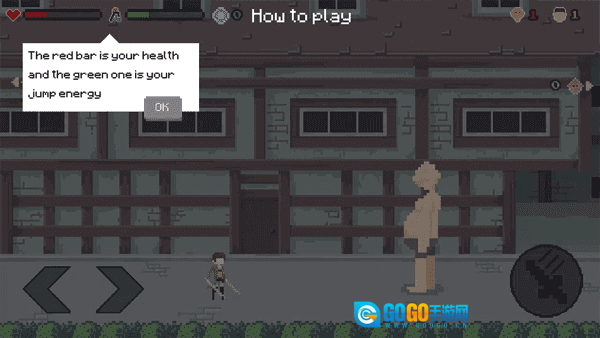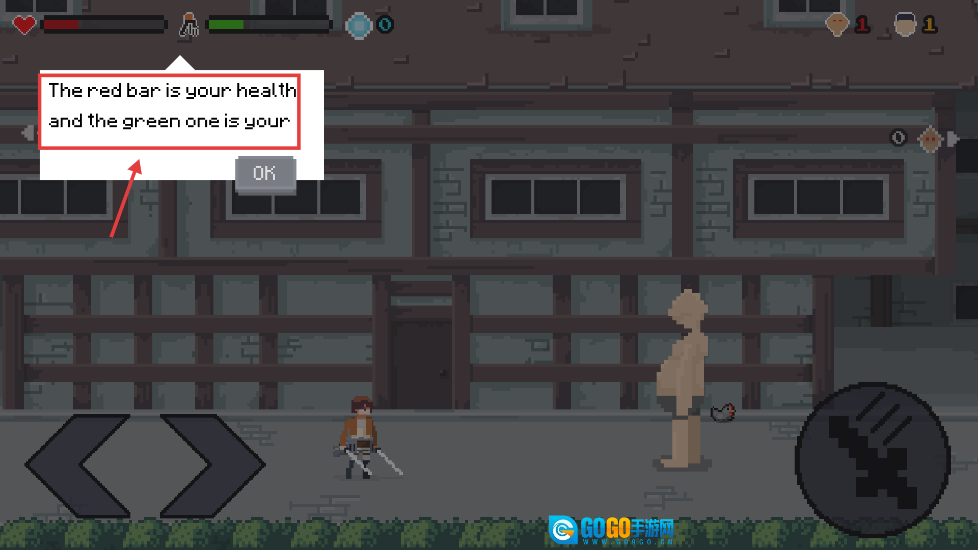 进入游戏后会弹出提示框,提示红色条代表生命值、绿色条代表能量,点击【OK】关闭提示即可开始战斗。