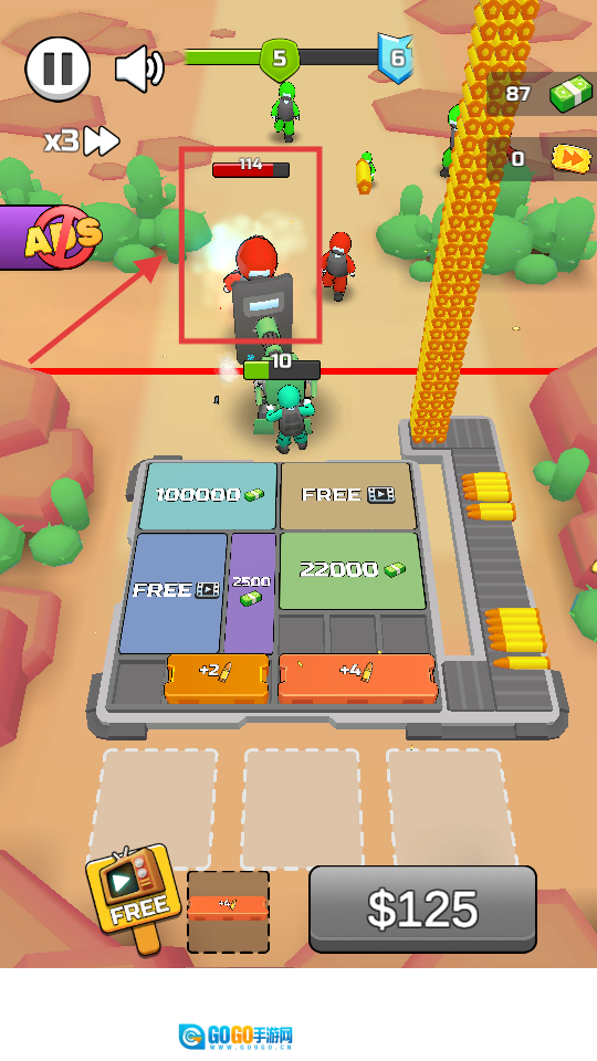 切换士兵来应对高血量丧尸,花费【$125】扩建炮台,以此提升输出能力。
