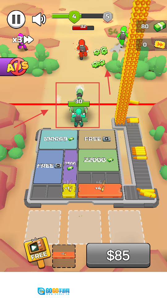 指挥士兵进入炮台位置攻击丧尸,收集【齿轮】和金币,通过积累资源来提升炮台等级。