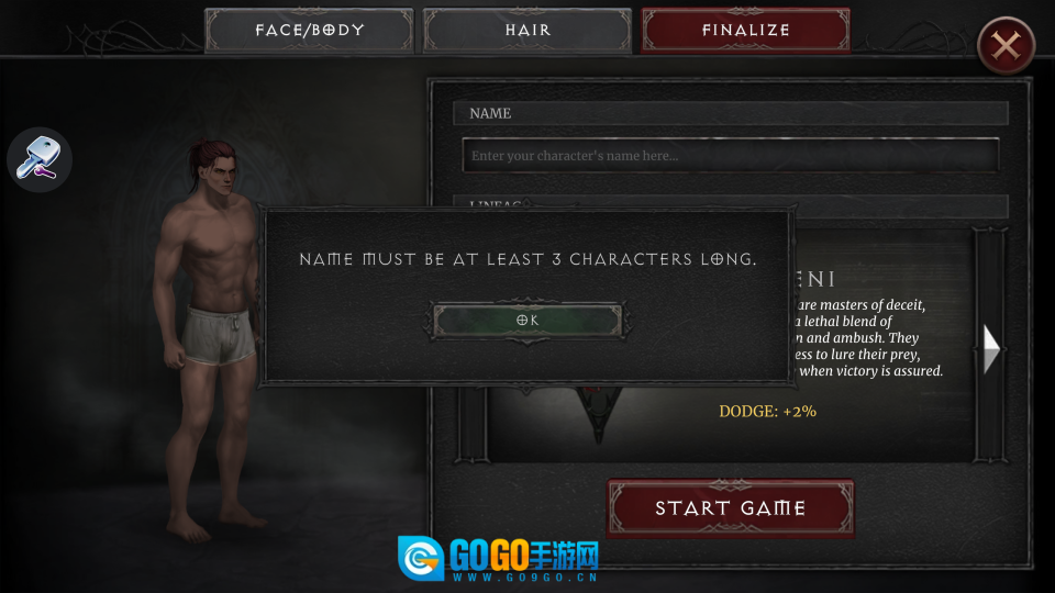完成角色命名与【NOSFERATU】血统的选择后,点击【STARTGAME】,即可正式踏入暗黑奇幻世界。
