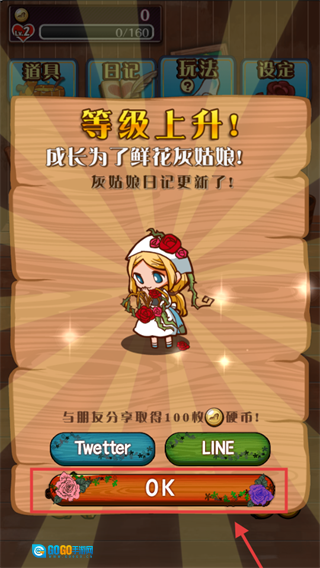 等级提升后点击【OK】确认,就能继续进行养成操作,也可以通过分享获得【100】枚【硬币】。