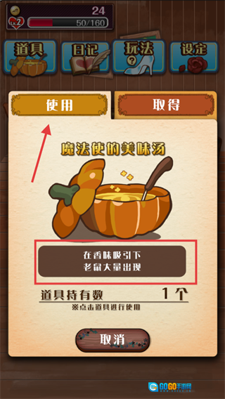 使用【魔法使的美味汤】,凭借其诱人香味吸引【老鼠】大批涌现,以此快速获取硬币,加速养成进度。