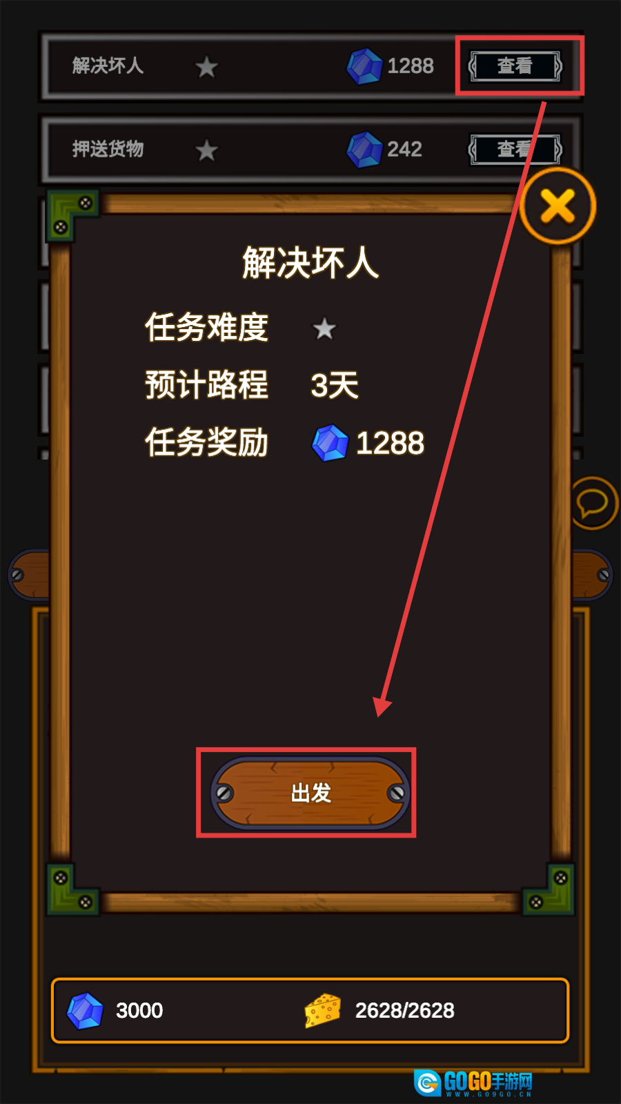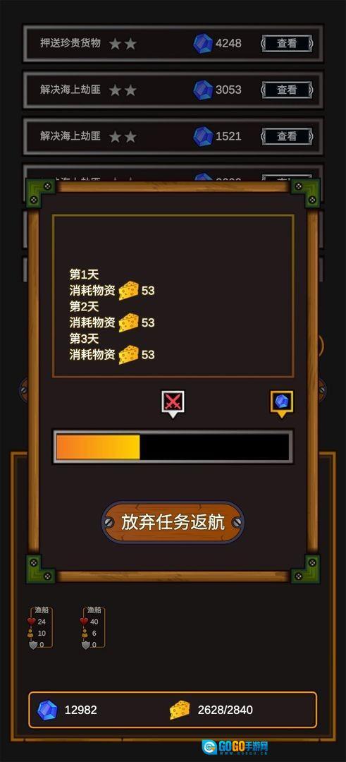 我们先查看【解决坏人】的任务详情,确认好任务难度、所需路程以及对应的奖励后,点击【出发】按钮接取该任务,从而开启这段海上冒险之旅。