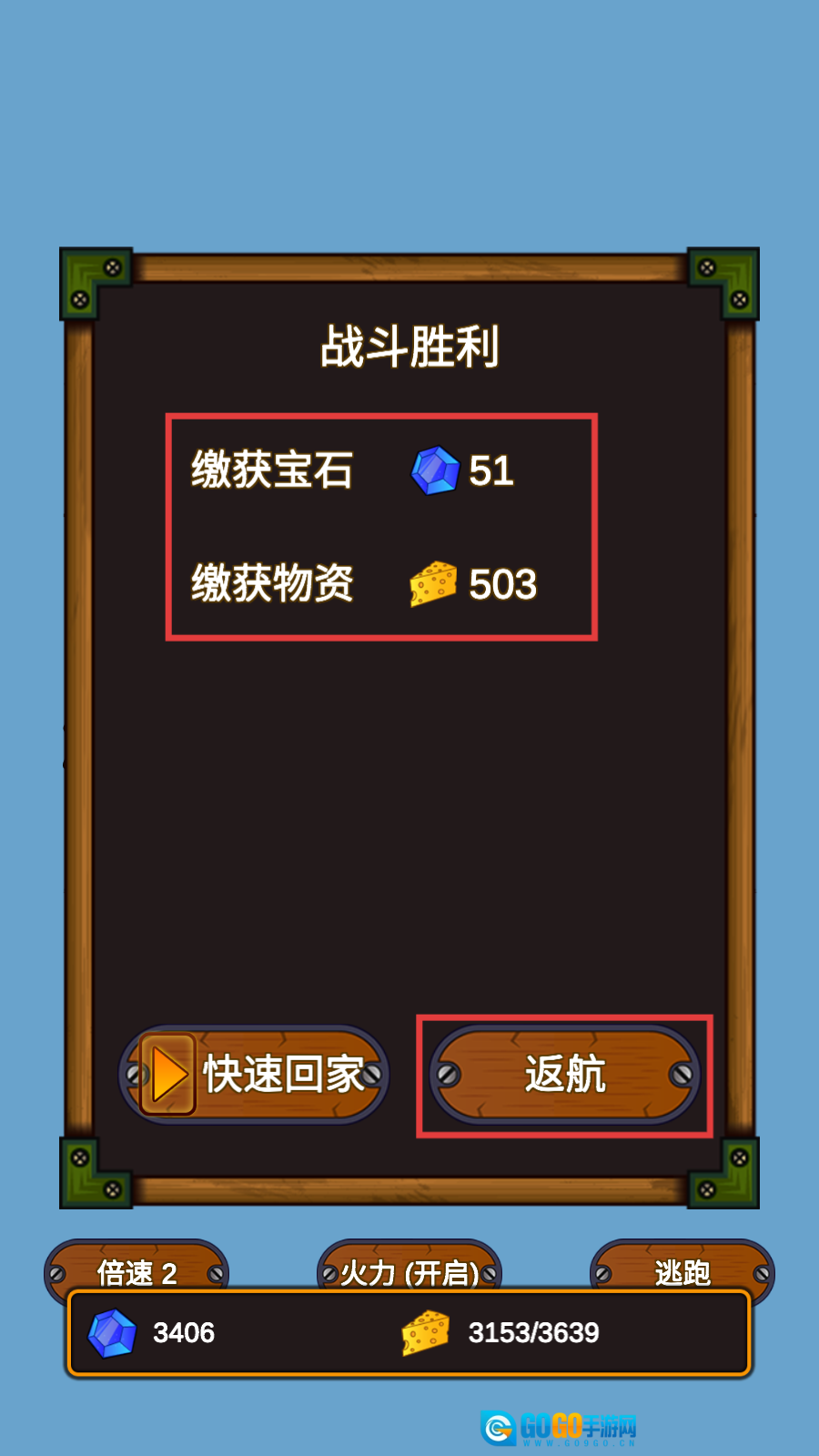 战斗获胜后,可获得宝石与物资作为奖励,点击【返航】按钮返回基地,以筹备后续行动。