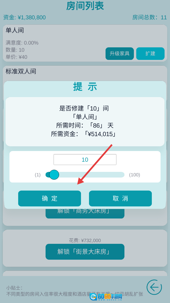 想给单人间扩容的话,点一下“扩建”按钮,选择要增建的数量,再确认下资金是否充足就行啦!