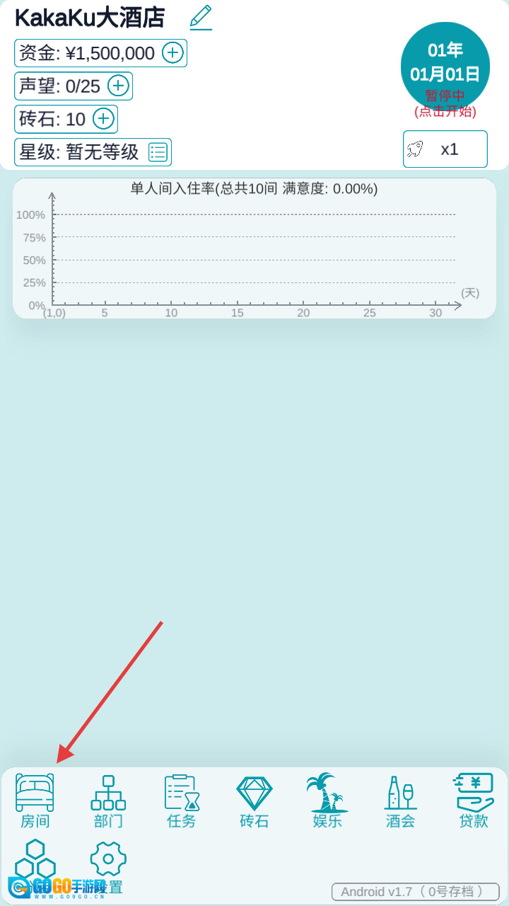 进入游戏后,点击左下角的“房间”按钮,进行客房管理与扩建规划。