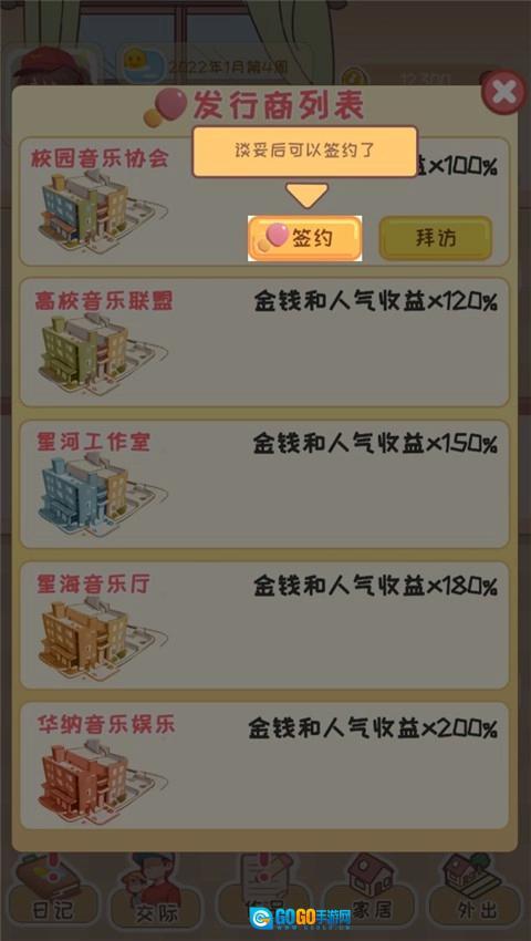 外出互动:每周有两次休息外出的机会,玩家可选择前往学校、工作室、步行街、公司等不同场景开展互动,从而获得多样的游戏体验。