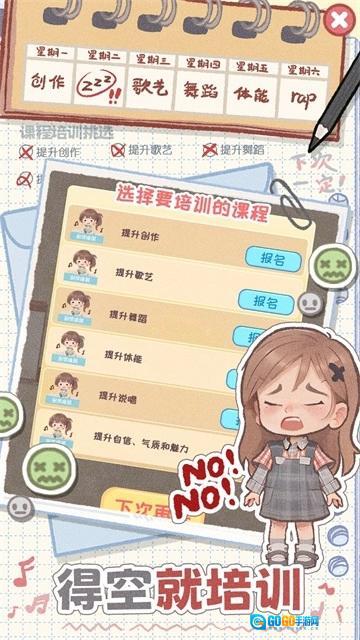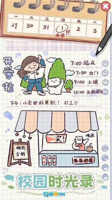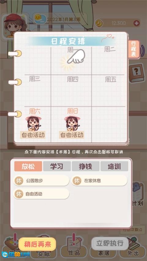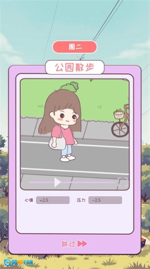 日程安排:玩家进入游戏后,首先要规划一周的日程,涵盖学习、赚钱、培训、休息、自由活动等项目。每日按照既定安排获取对应的属性值,例如到公园散步能够增加心情值、减轻压力值。