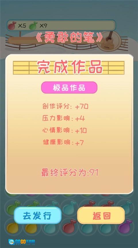 创作作品的方式是点击下方的创作按钮,完成对应的小游戏后就能得到作品。作品设有评分机制,并且会在不同维度产生影响,评分越高意味着作品的质量越出色。玩家可以选择签约工作室,之后挑选合适的发行商来发布自己的作品并获取收益,而收益的多少会和作品评分、发行商等多个因素有关。