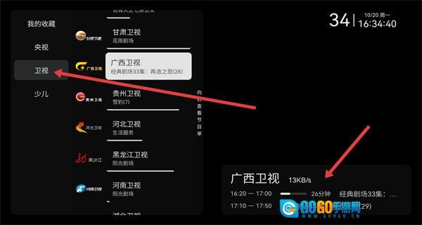 切换侧边栏的卫视分类,选择广西卫视、贵州卫视等频道,查看其节目单(例如广西卫视的经典剧场),节目单右侧会显示实时播放进度。