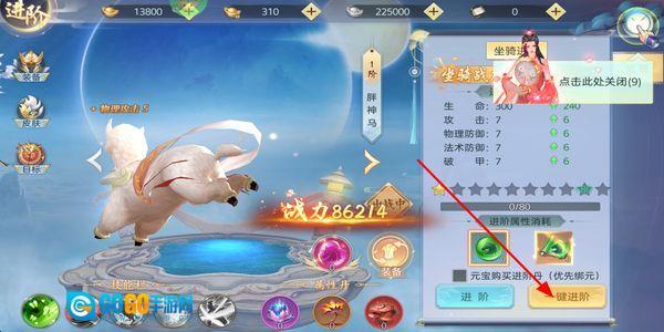在坐骑界面中点击一键进阶按钮,通过消耗对应的道具来提升坐骑等级,从而增强其属性以及战力加成。