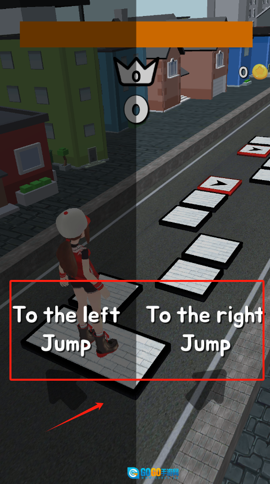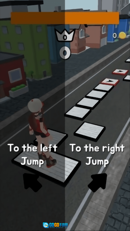 游戏的操作界面里,彩色箭头方块会提示方向,屏幕下方则用红色字体标注着向左跳和向右跳的操作指引。