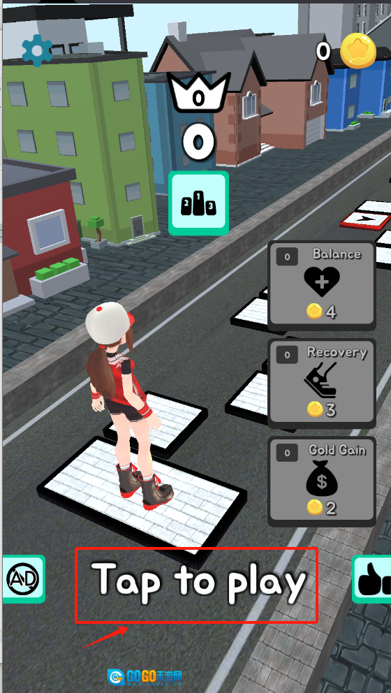 游戏的初始界面布局如下:顶部区域展示着分数数值与资源图标,下方设有一个红色边框的“点击开始游戏”提示框,右侧则排列着点赞图标和广告图标。