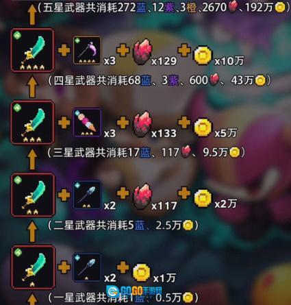 从1星提升至5星,总共需要消耗蓝色武器272件、紫色武器12件、橙色武器3件、血源矿2670个以及金币192万。