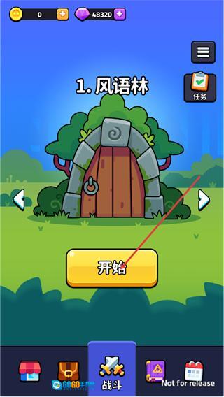 进入战斗界面后,先选择风语林关卡,在确认关卡信息无误后,点击界面上的开始按钮,即可进入该关卡的战斗场景。