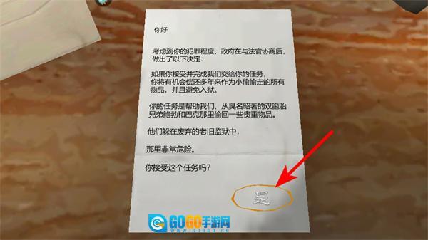 进入任务对话界面后,点击红色箭头所指的“是”按钮,接受当前任务,这是开启游戏冒险的关键操作。
