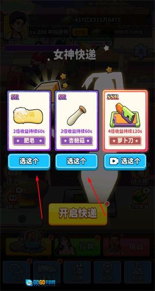 在女神快递界面,挑选好对应的道具后点击开启快递,就能获得收益加成道具来助力经营。
