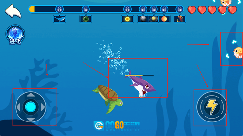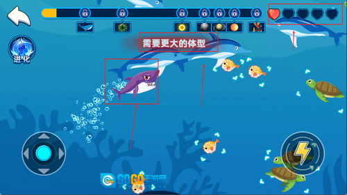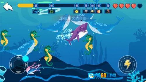 随着吞噬的生物越来越多,鲨鱼的体型会随之增大,进而解锁更强大的属性与技能,这样就能挑战更高等级的对手,获取丰厚的奖励。