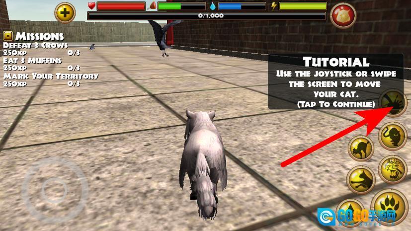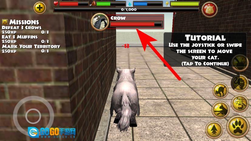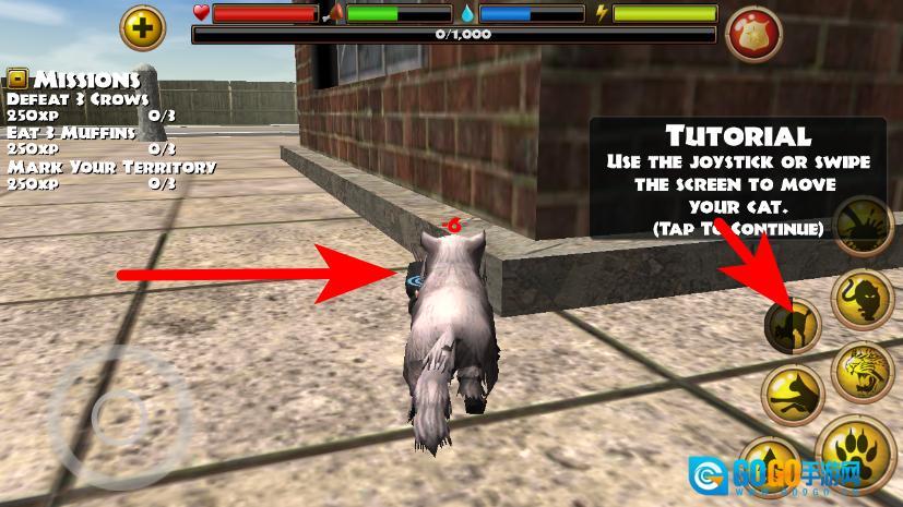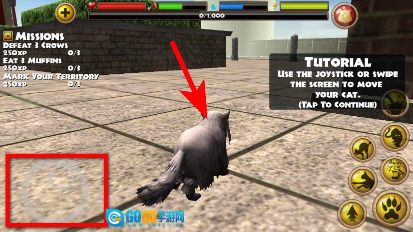 在游戏界面,操作左侧摇杆,控制猫咪移动方向。