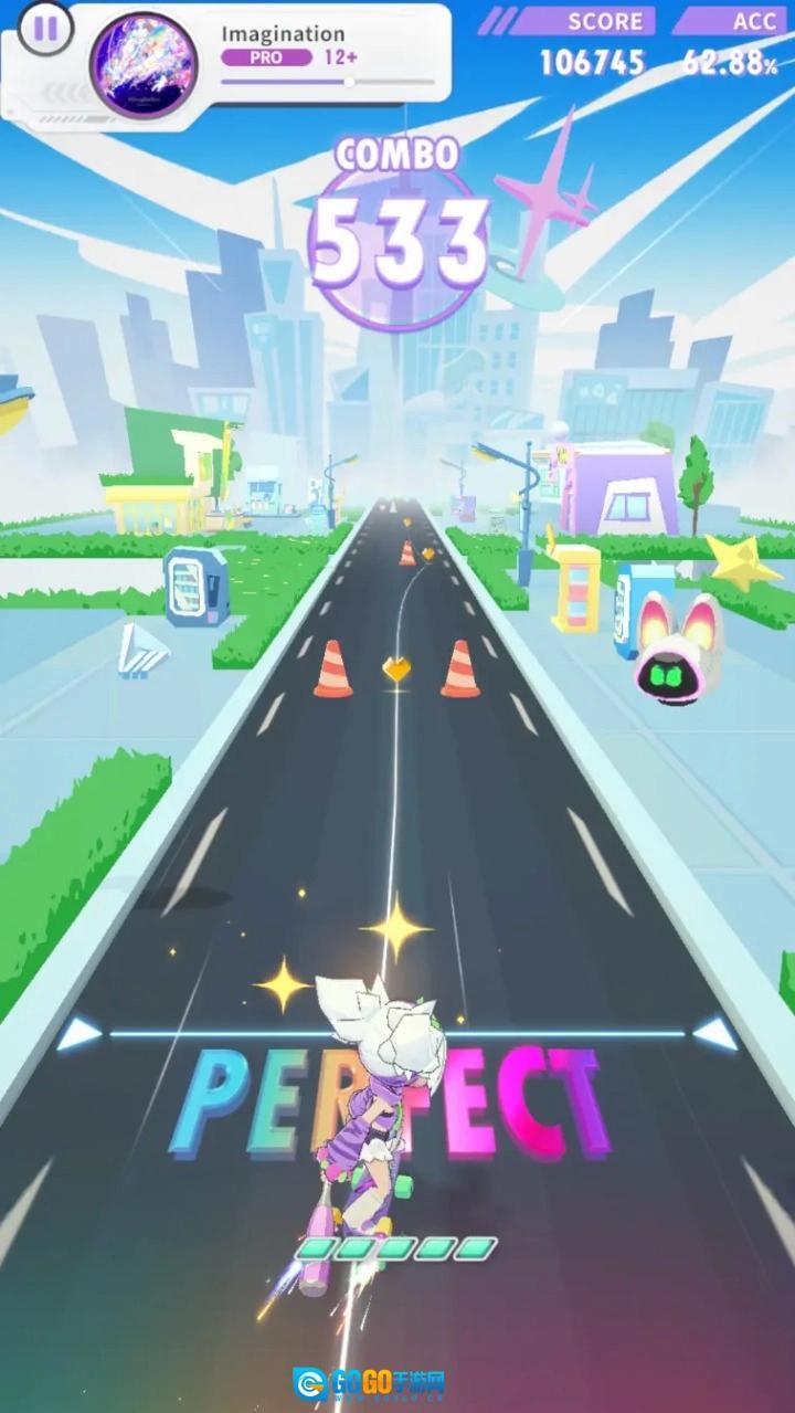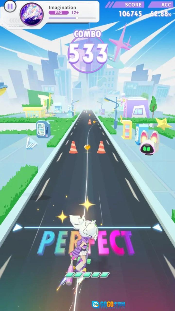1.玩家操控角色在兼具未来感与科技感的赛道上飞速驰骋,要依据背景音乐的节奏,精准击中迎面而来的音符机器人。