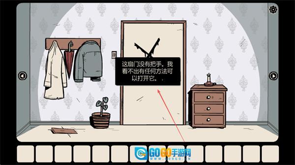 观察当前场景,这扇门没有把手,没办法直接打开。你需要先收集地面上的物品,这样才能推进解谜的流程。
