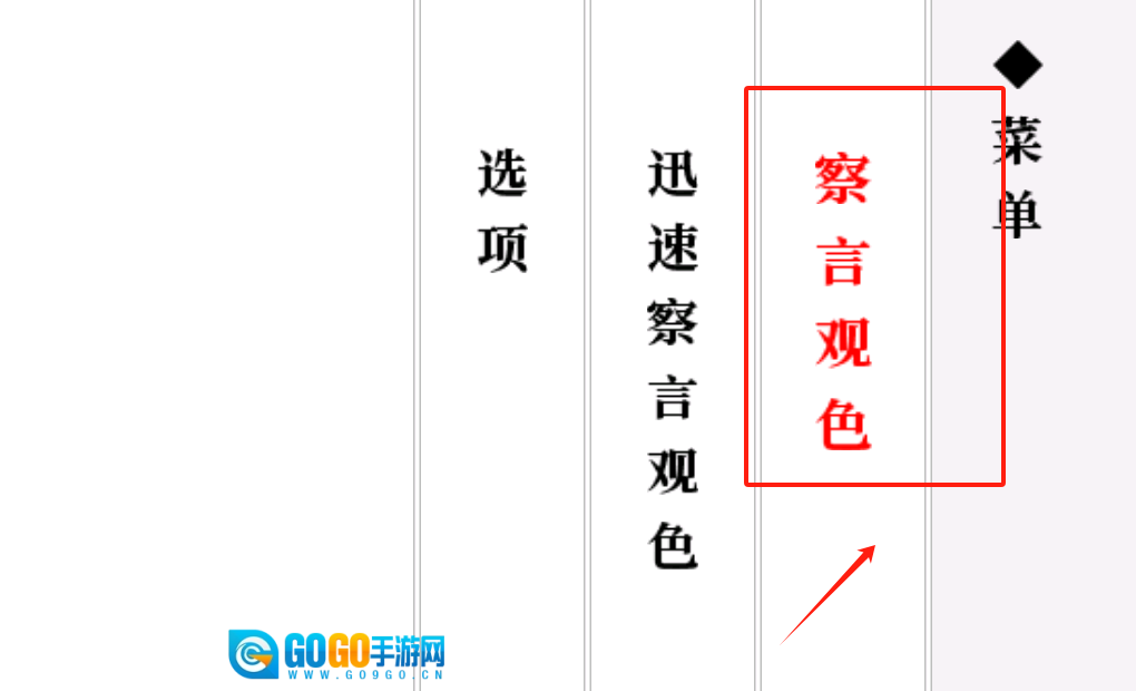 点击右侧被红色框标注的“察言观色”选项,即可进入游戏的主功能界面,界面左侧设有相关的操作菜单。