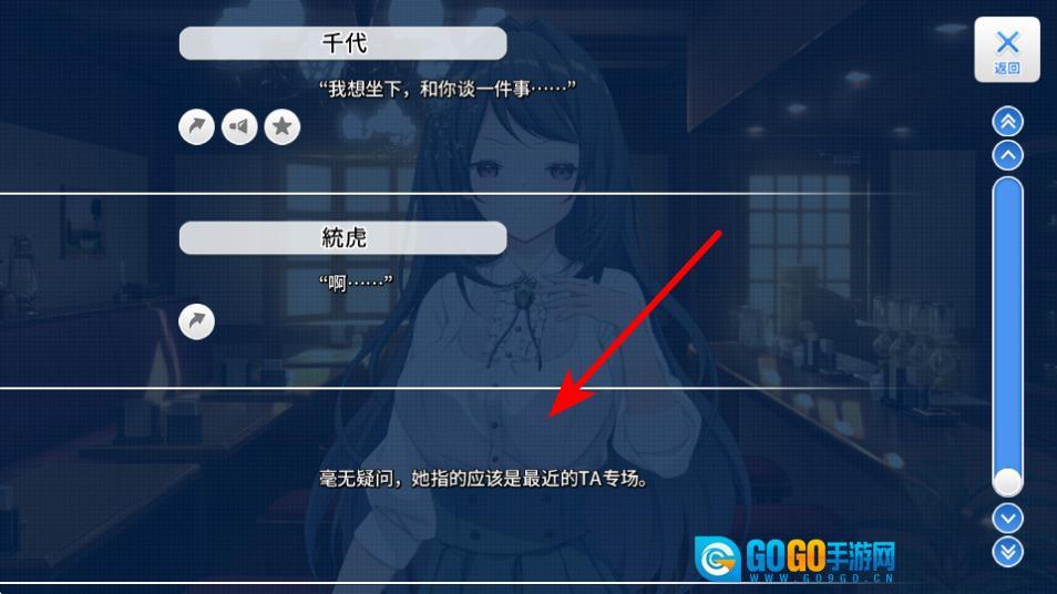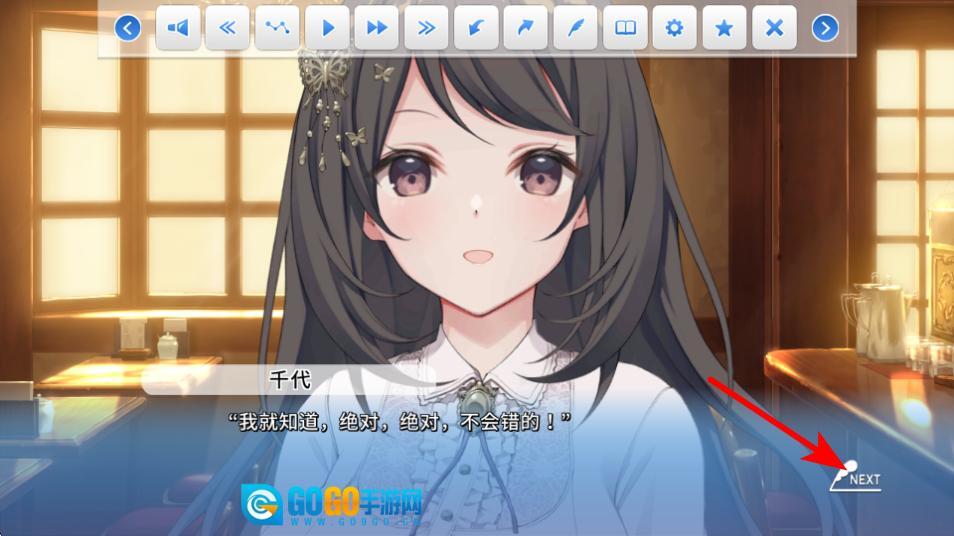 当对话暂停时,点击那个被红色箭头所指向的NEXT按钮,就可以继续推动剧情发展,进而查看之后的角色互动相关内容。