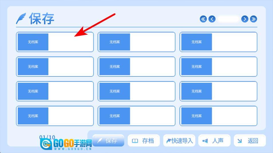 在存档界面,点击红色箭头所指的空白存档位,就能把当前的游戏进度存到这个位置,防止进度丢失。