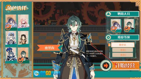 在角色选择界面选定角色后,确认雇佣人员与难度等级设置,点击开始经营即可开启游戏流程。