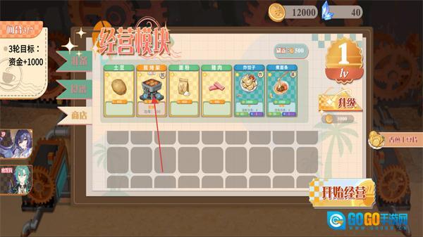 进入经营模块界面后,在商店里挑选并购置煎烤架这类经营所需的设施,待所有准备工作就绪,点击开始经营按钮来推进游戏回合。