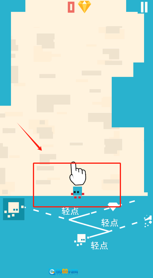 点击屏幕上的白色手指图标,操控蓝色方块角色顺着虚线路径移动,根据提示轻点操作即可。