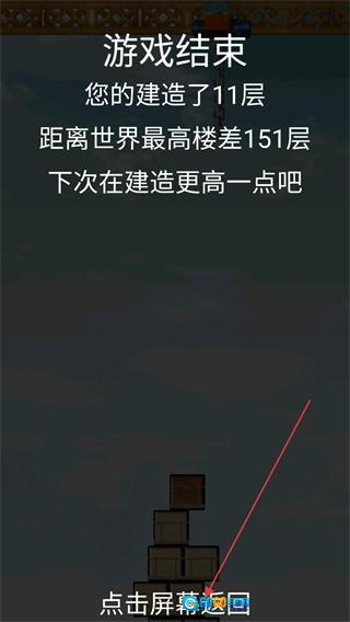 当看到游戏结束界面上显示的层数结果后,点击屏幕进行返回操作,就能为再次挑战做准备,以便堆叠出更高的层数。