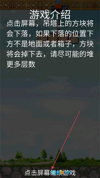想了解游戏规则可以查看游戏介绍,点击屏幕就能让吊塔上的方块掉落,要让方块落在地面或者箱子上来堆叠层数,之后点击屏幕就能继续游戏。