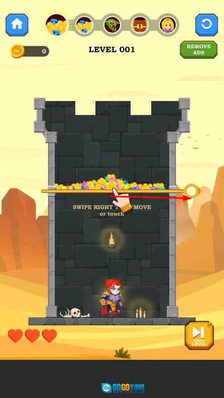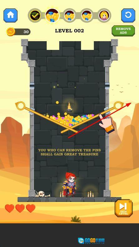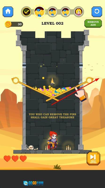 进入游戏后,先浏览关卡场景,观察英雄被困的位置以及周围陷阱的分布情况,进而初步判断拉针的顺序。