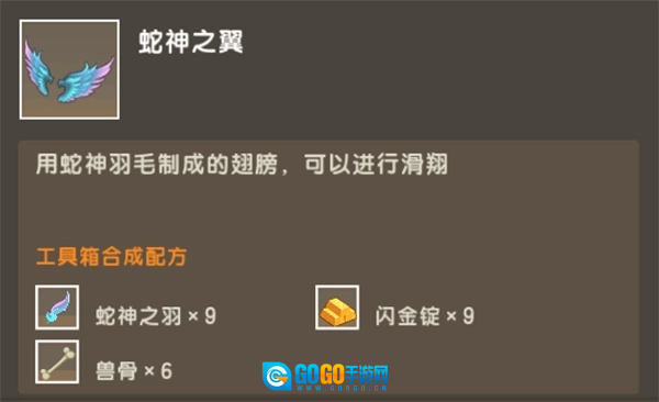 合成配方为:蛇神之羽(由羽蛇神二阶段掉落)、闪金锭与兽骨。一旦穿戴该物品,即可解锁“无限滑翔”能力——长按跳跃键能够升空,松开后则自由俯冲,借助地形的起伏变化,还能完成“贴地掠行”“悬崖折返”“峡谷穿行”等一系列高阶机动动作。
