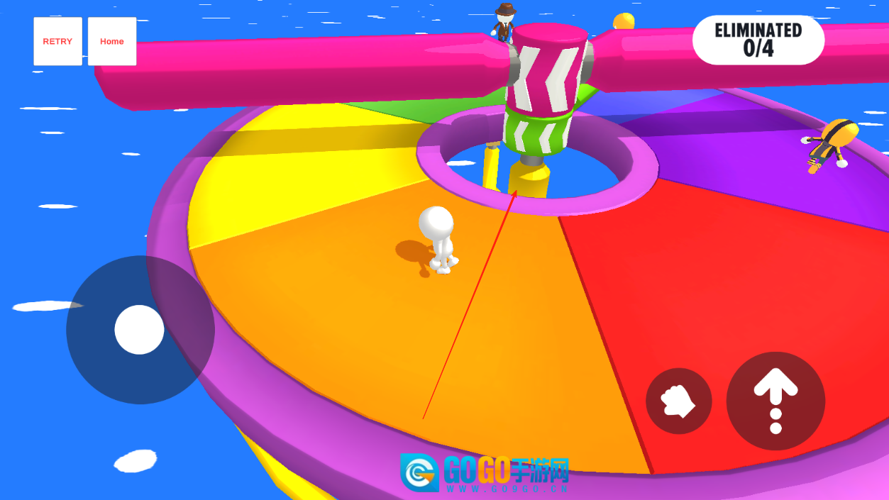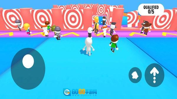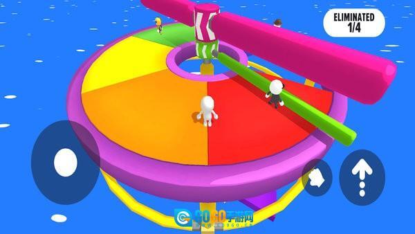 进入游戏后,选择第一个模式,上方的杆子会持续旋转,脚下的方块有可能坍塌,要注意别掉下去。