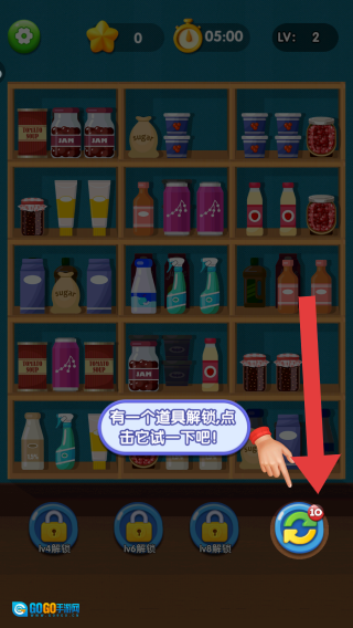 这里有个道具解锁的提示,点击就能免费使用这个道具。游戏的玩法是整理货架上的物品,借助道具来帮助通关。