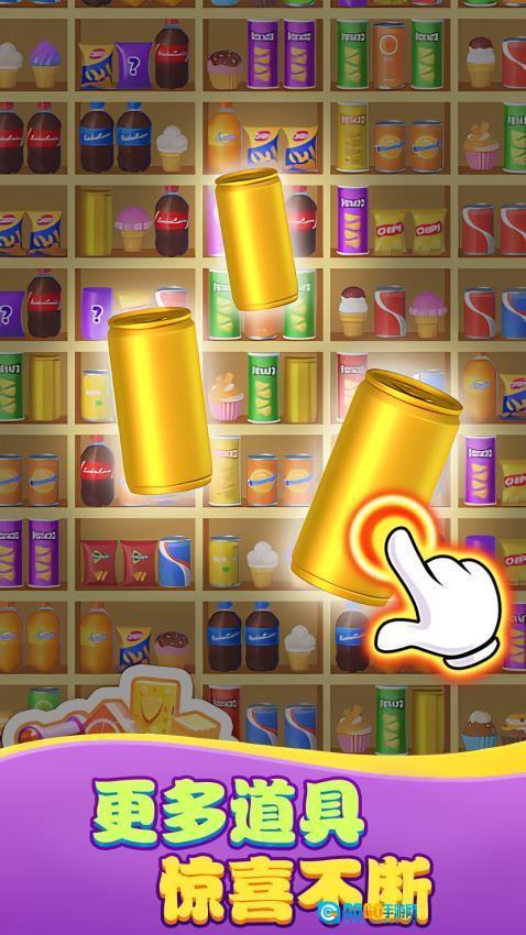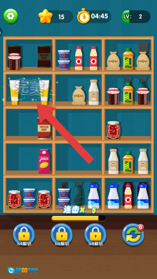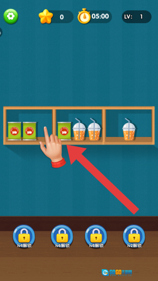 按照提示把货架上的饮料罐与饮料杯归置到同一个货架格,达成关卡目标,下方还有尚未解锁的关卡V4解锁等内容。