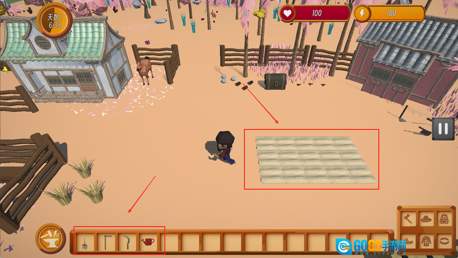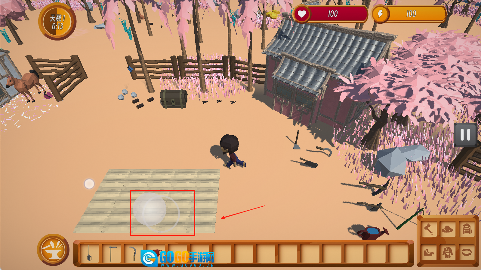 屏幕左侧负责角色的移动与操作控制,右侧设有互动按钮,下侧则陈列着各类作物和工具。