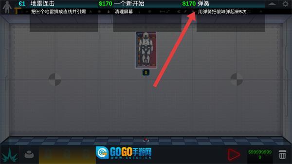 查看顶部任务提示“用弹簧把傻缺弹起来5次”,明确当前的任务目标。