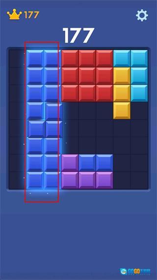 当分数和皇冠数均为177时,留意左侧红色方框里的蓝色方块,移动相应方块让它们连成完整的一片区域,这样就能完成消除了。