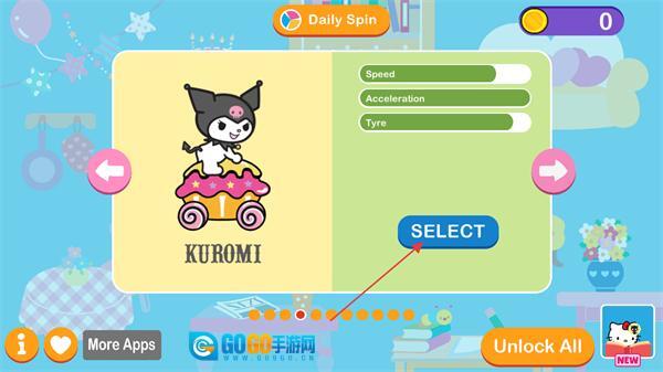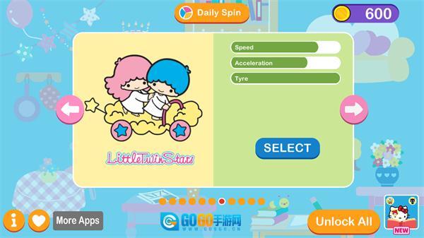 可以解锁三丽鸥家族的凯蒂猫、玉桂狗、布丁狗等角色,它们各自都有专属赛车,像羊角面包车、鳄鱼车这类造型独特的车型,并且每款赛车都具备不同的性能。