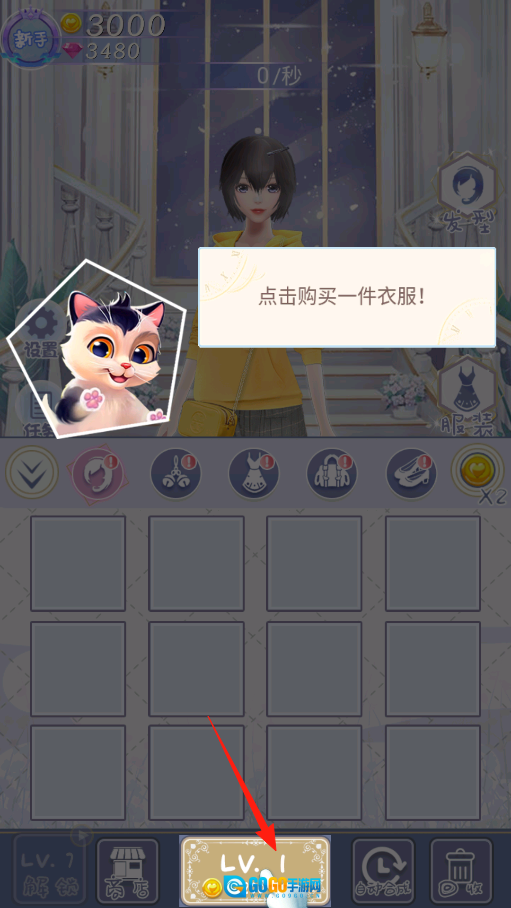在衣柜界面,按照提示点击LV.1选项,花费金币购买新衣服,借助等级解锁的规则来获取基础款式的服饰,通过这样的操作逐步丰富衣柜里的服装,感受消耗资源与收集服饰的游戏乐趣,从而推动装扮任务的进展。