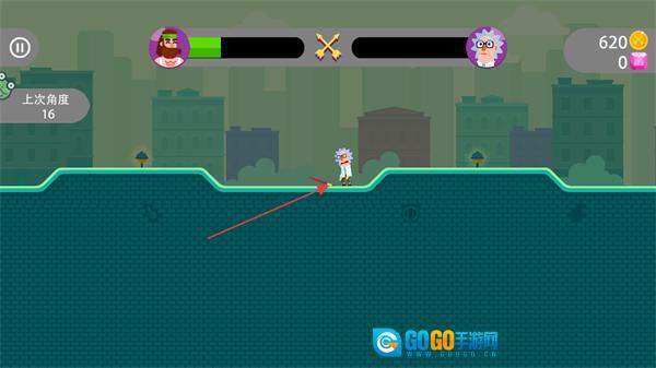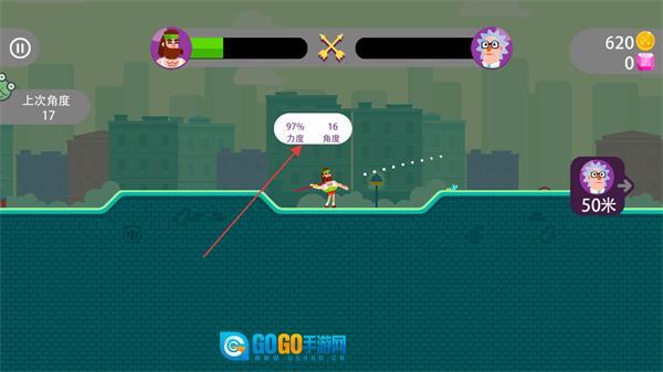 拖动角色,将力度调整到97%、角度设定为16度,瞄准目标后发射箭矢。