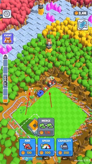 点击MERGE按钮合并伐木车,以此提升伐木效率,这是积累资源的关键步骤,让我们开启伐木经营之旅。