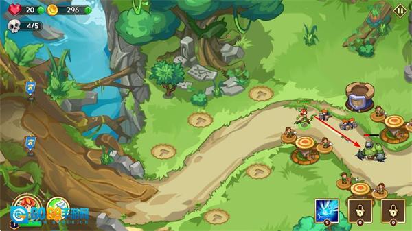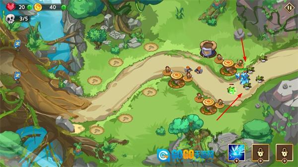 在卡通风格的森林场景里,把防御塔安置在道路旁的空地上,以此阻拦敌人的行进。
