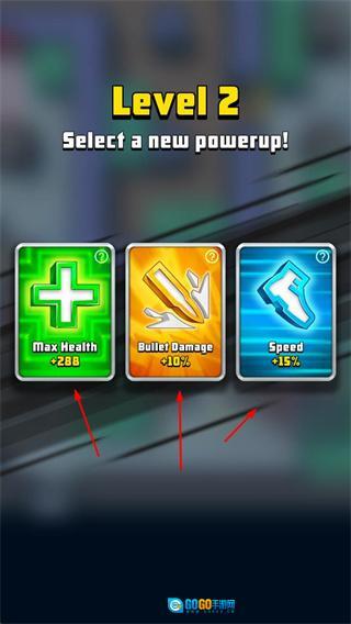 当关卡提升至新等级时,玩家可以选择新的能力强化选项,以此来增加角色的生命值、子弹伤害、移动速度等各项属性。